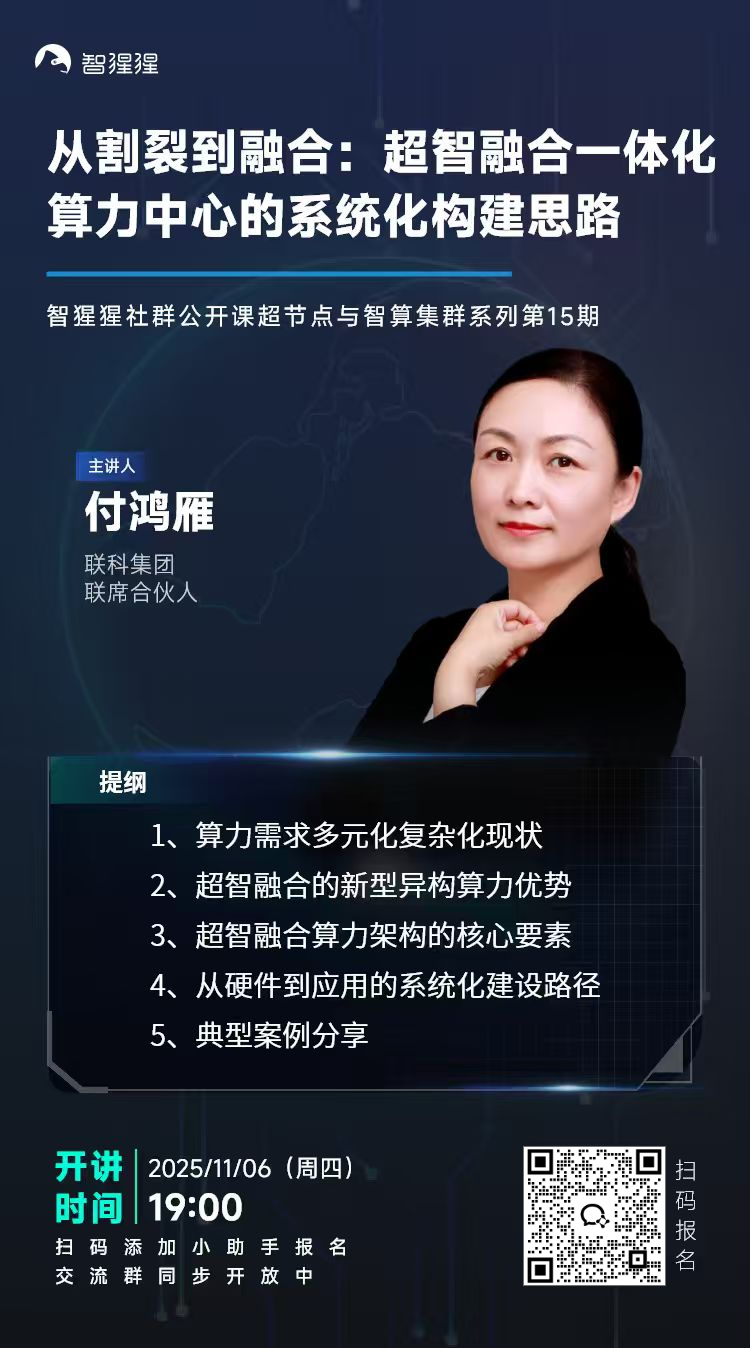 智猩猩公开课超节点与智算集群系列第15期由联智科技CEO付鸿雁以视频形式主讲,主题为《从割裂到融合:超智融合一体化算力中心的系统化构建思路》。付鸿雁从算力需求多元化复杂化现状、超智融合的新型异构算力优势以及算力架构的核心要素、从硬件到应用的系统化建设路径四个方面进行了深入分享,并回答了用户提问。现从27个提问中精选12个Q&A特此分享。