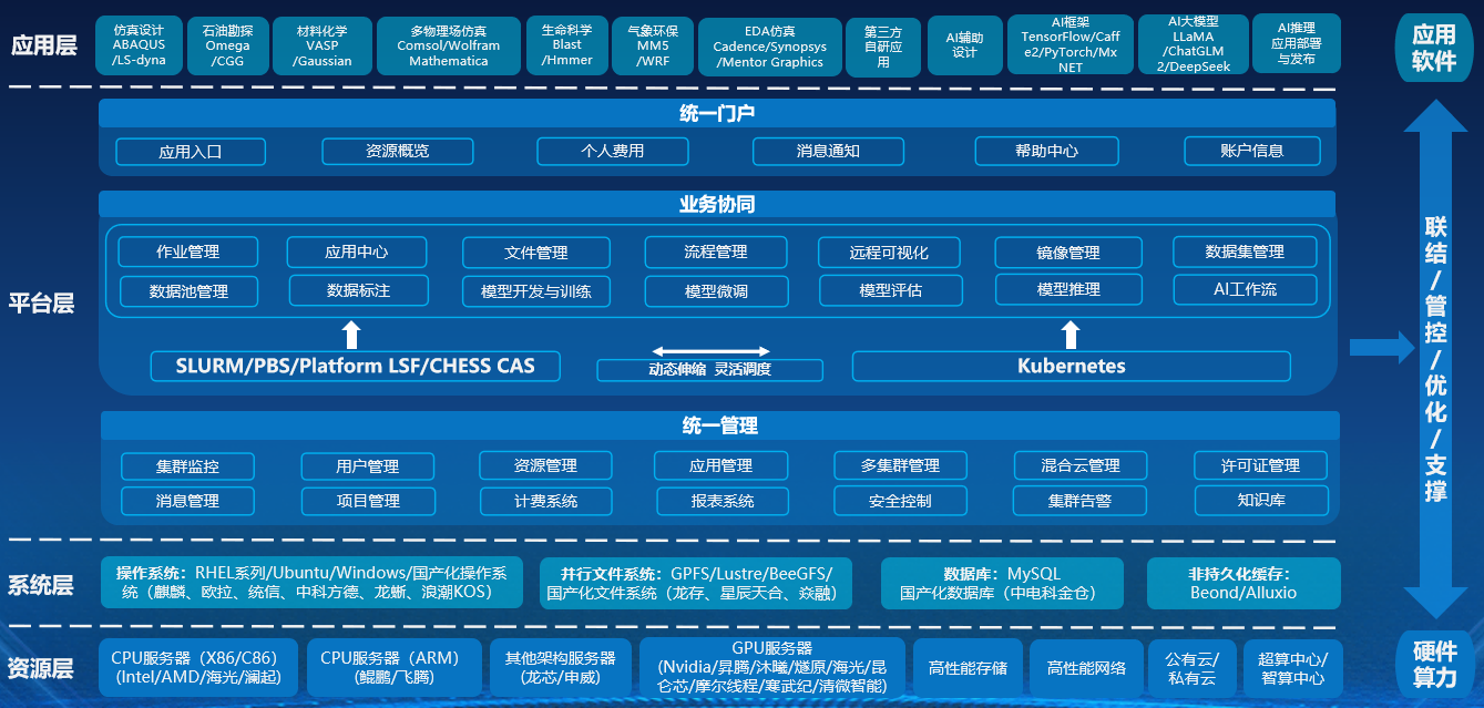 自主创新是联智科技斩获殊荣的核心密码。公司自主研发的超智融合算力管理平台CHESS,采用全栈国产化技术架构,核心技术完全自主可控,将HPC多种应用与AI模型开发与训练、模型推理等业务无缝集成,支持传统SLURM作业调度的同时,也支持Kubernetes容器模式下的编排调度,打造符合HPC应用和AI业务的一体化算力平台,通过“一套平台统管、一本账目统算”的核心架构,高效应对HPC与AI工作负载的资源动态分配、跨场景作业调度,满足超算/智算两种异构算力的集中化纳管、最大化利用以及多元化协同,为科学计算与智能应用等复杂计算任务提供高效、稳定、可持续的算力支撑。