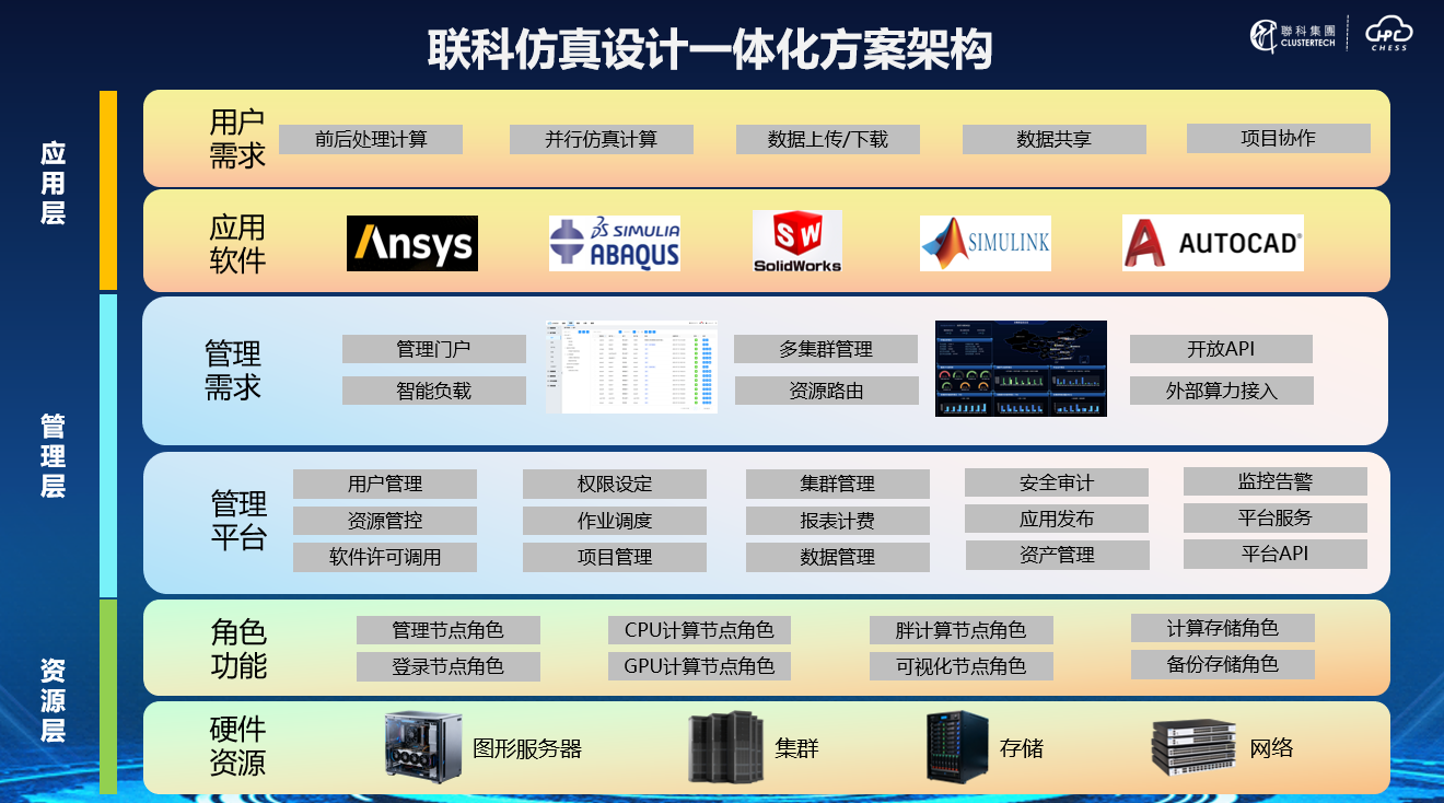 针对这一行业难题,联智科技提出创新解决方案——通过“集群+图形工作站集中建设部署” 的一体化思路,整合超算/智算集群与高性能图形工作站资源,再依托联智科技自研的超智融合算力管理平台CHESS,实现算力资源的统一调度、监控与管理。用户仅需通过 Web 门户即可“一键启动”全流程,完成从CAD建模、CAE求解到结果可视化的闭环操作,真正实现“一套资源、一个平台、一条流程”的高效仿真设计新模式。
