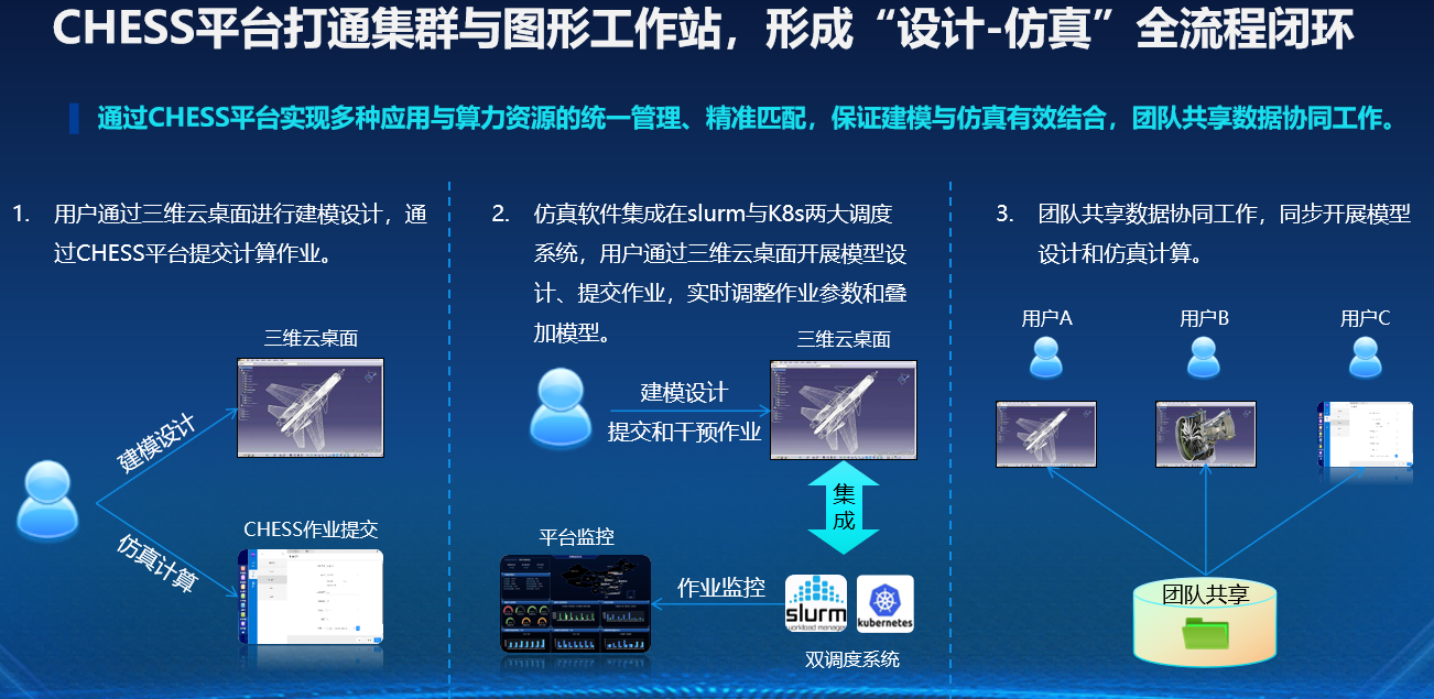 通过联智科技自研的超智融合算力管理平台CHESS,实现对计算与图形资源的智能调度与任务协同,支撑从三维建模、仿真分析到结果可视化的全流程一体化运作,助力工程师实现“一键式”高效研发。
