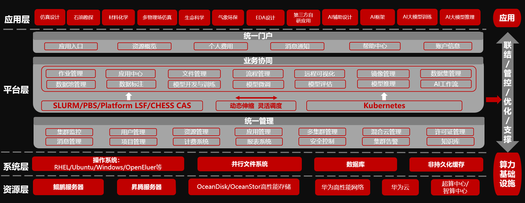 付鸿雁在演讲中重点介绍了联智科技自主研发的超智融合算力管理平台CHESS。该平台深度适配华为鲲鹏CPU、昇腾NPU、华为网络、华为存储及欧拉操作系统,形成从硬件基础设施、操作系统到算力调度的全栈技术闭环,打造了端到端国产化算力底座。通过CHESS平台,用户可实现高性能计算(HPC)与人工智能(AI)工作负载的统一调度与异构资源集中管理,突破传统算力架构的效率瓶颈,为科研创新提供高效、灵活的算力支撑。